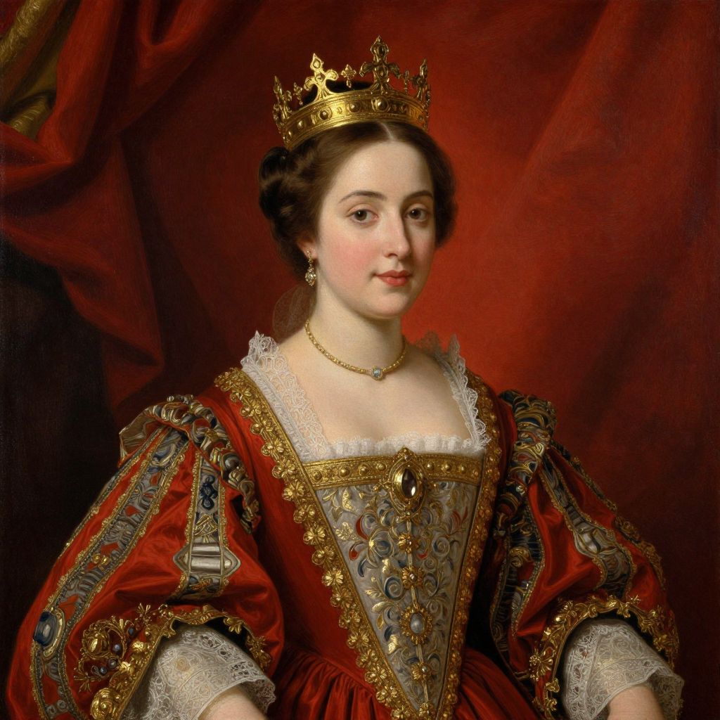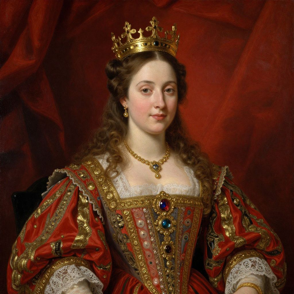 A regal portrait rendered in the classical oil painting style depicts a woman adorned in ornate attire, featuring a gold crown, intricate lace, and a richly detailed red dress with gold embellishments, set against a dramatic backdrop of deep red drapery and warm, golden lighting.
