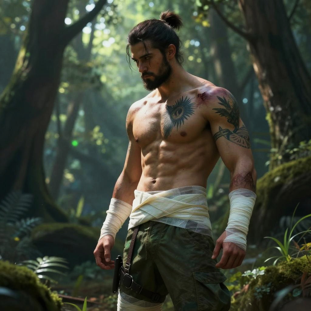 Best quality, masterpiece, ultra high res, detailed background, realistic, illustration, Expressionism, 1boy, solo, mature male, muscular, facial hair, high ponytail, scar, tattoo, bandages, pants, green magic, forest, reflection, volumetric lighting, depth of field