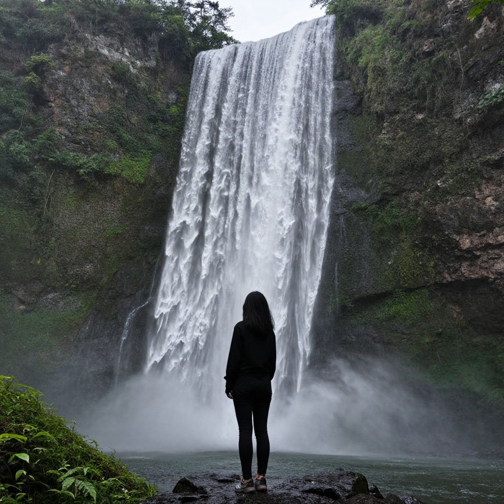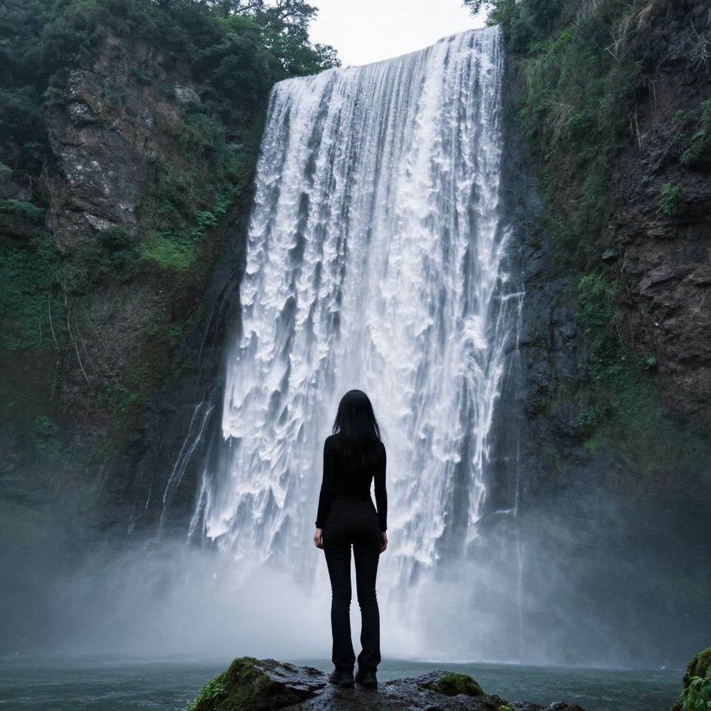 Woman stands contemplatively against the majestic backdrop of a cascading waterfall, framed by lush green cliffs and misty spray, her silhouette highlighted by the natural grandeur of the scene.