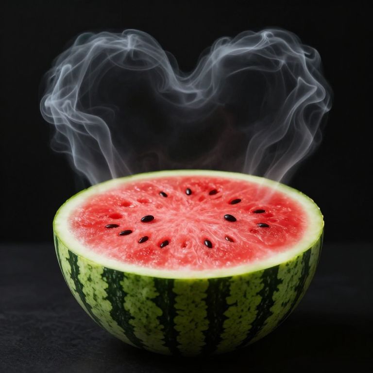 Kawaii Aesthetic juicy and delicious-looking round watermelon without seeds. smoke in shape of a heart in the background. All set against a solid black background,