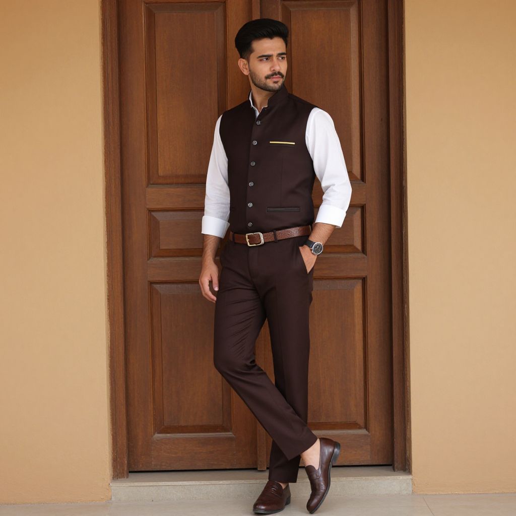 Photograph of a young South Asian man standing in front of a wooden door with a beige wall background. He has short, dark hair, a trimmed beard, and a serious expression. He wears a black vest over a white dress shirt, black trousers with a brown leather belt, and dark brown dress shoes. His right hand is in his pocket, and he wears a dark wristwatch on his left wrist. The door behind him has a rich, dark wood finish. The lighting is natural, highlighting his well-groomed appearance and formal attire.