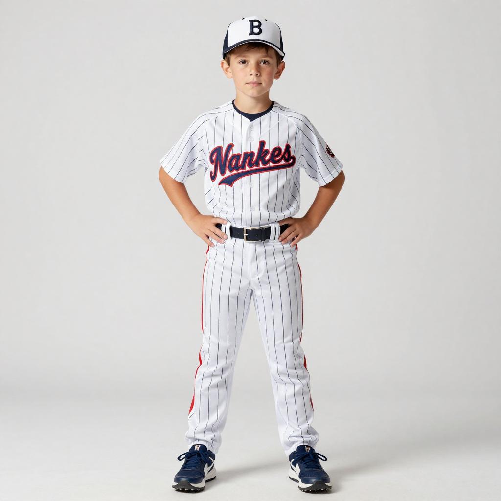 Photograph of a young boy standing confidently in a full baseball uniform. He's wearing a white pinstriped jersey with "Yankees" in red cursive, a matching cap with a black "B", white pants, and blue sneakers. His hands are on his hips, and he's looking directly at the camera. The background is plain white, making him the focal point. The lighting is bright and even.
