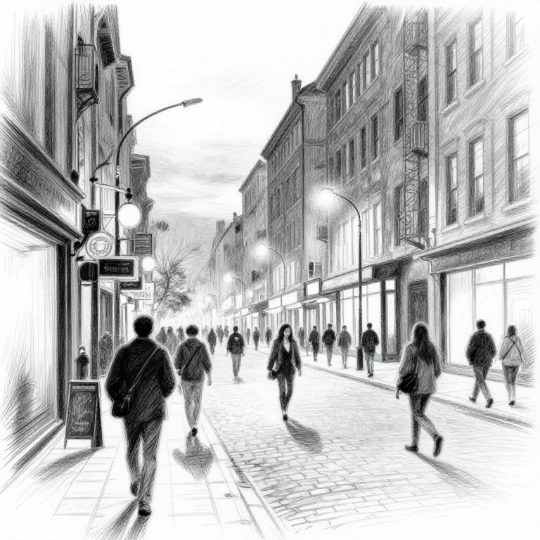 Black-and-white sketch of a bustling urban street, with pedestrians walking along brick-paved sidewalks between tall, historic buildings. Street lamps and storefront signs line