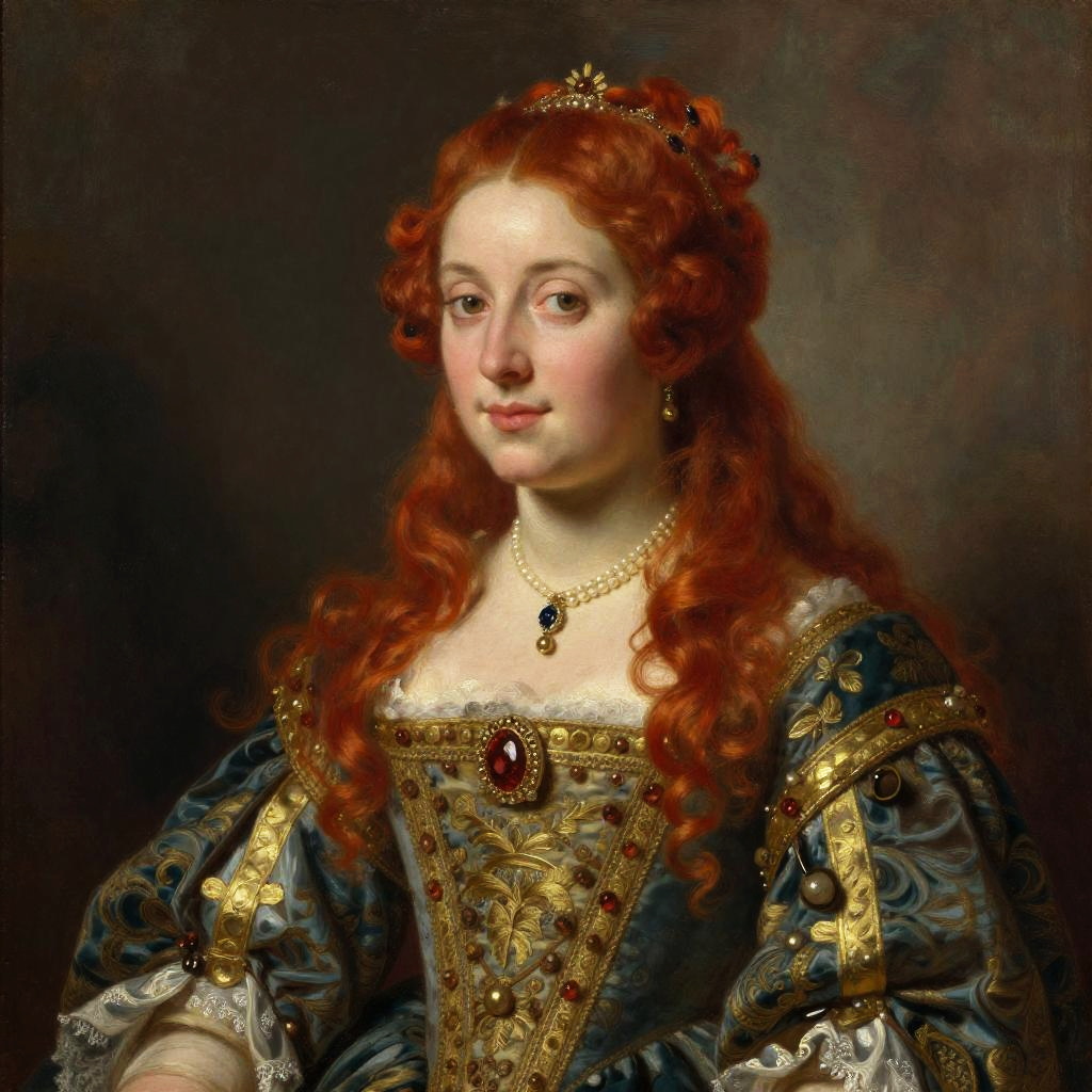 Red hair renaissance painting of a noblewoman in an ornate gown, intricate details in fabric texture, soft natural lighting, oil paint style, warm color palette focusing on rich reds and golds, classical portrait composition.