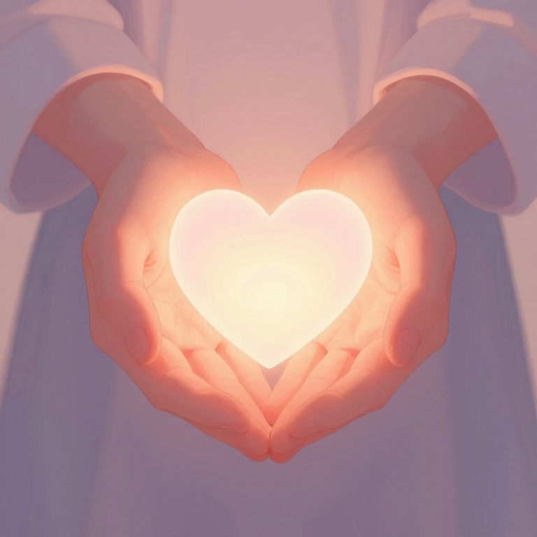 Caring hands gently holding a glowing heart, surrounded by soft pastel lights and warm shadows, symbolizing empathy and compassion, in a serene and comforting environment, detailed and emotive digital art.