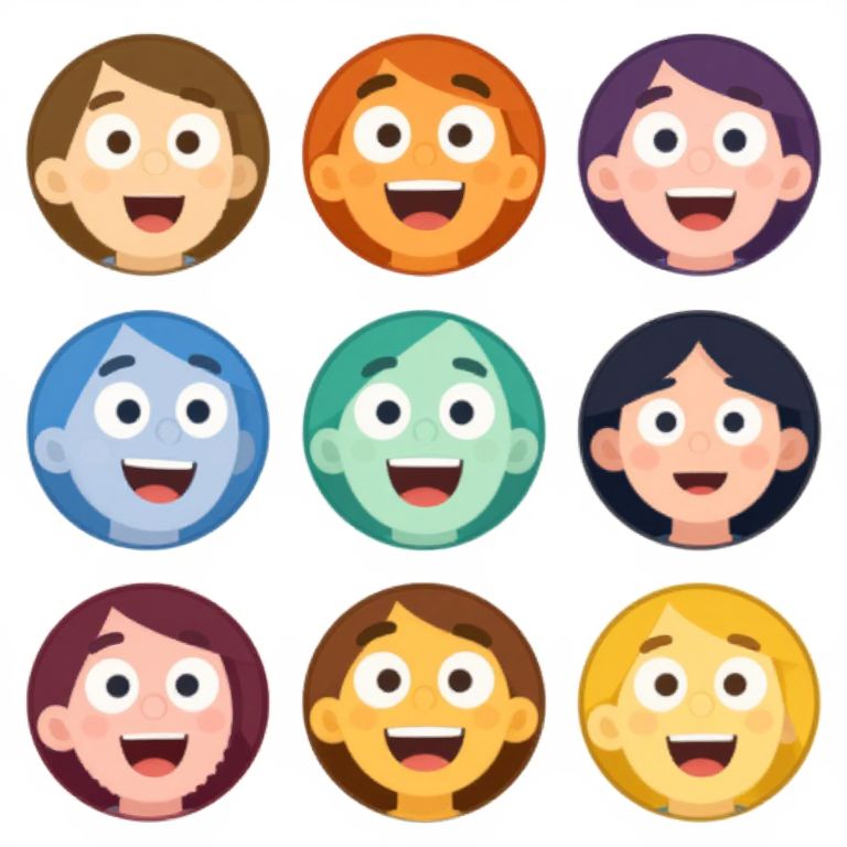 Cartoon illustration of nine smiling faces with diverse skin tones and hair colors, arranged in a 3x3 grid, each with large, expressive eyes