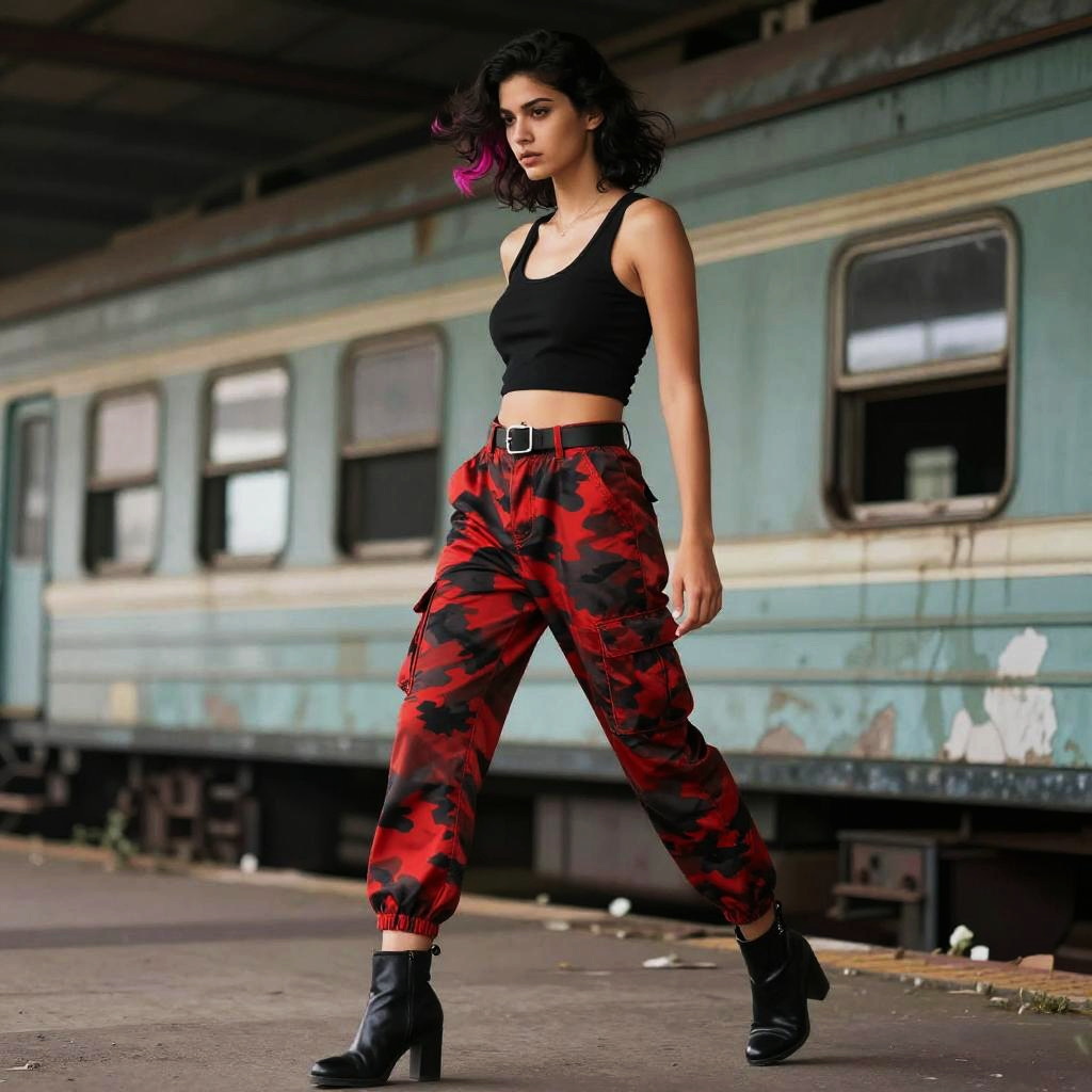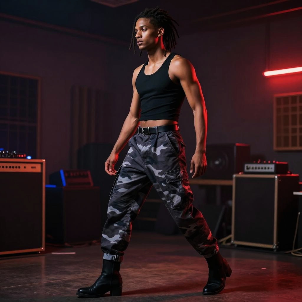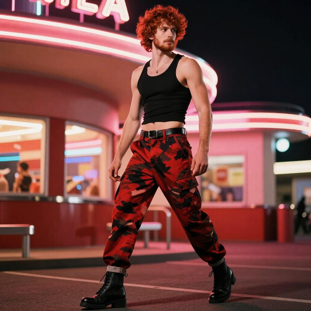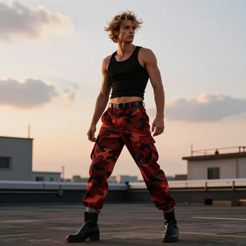 Slim man with spiked silver hair at modern city plaza with reflective glass buildings, wearing a black cropped tank top with a scoop neck, red and black camouflage cargo pants high-waisted, black belt with a silver buckle, cuffed hems, black ankle boots with a slight heel; full-body pose with confident stride, hair in motion, soft white and amber daylight, fashion editorial vibe, photorealistic, dynamic composition, shallow depth of field, 35mm lens, crisp fabric folds, realistic skin texture, cinematic contrast, faint haze, subtle bokeh.