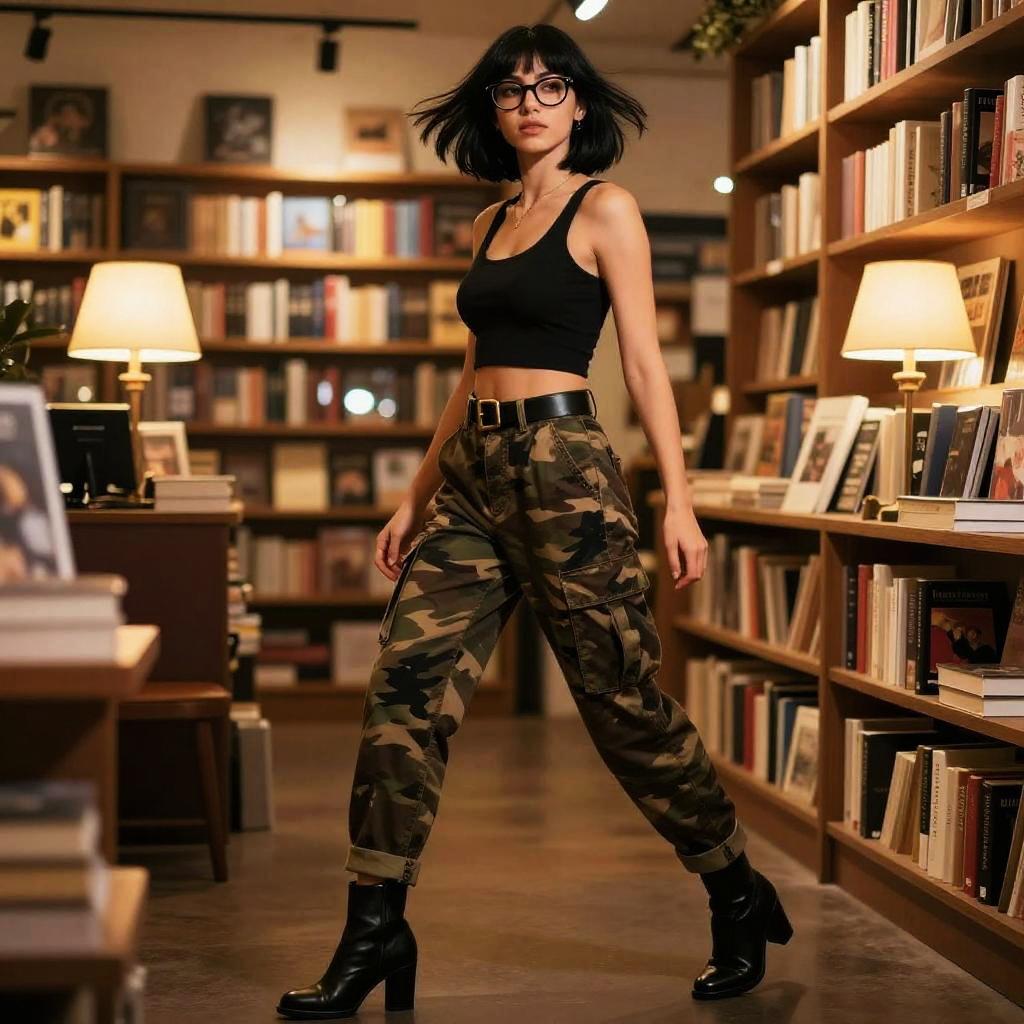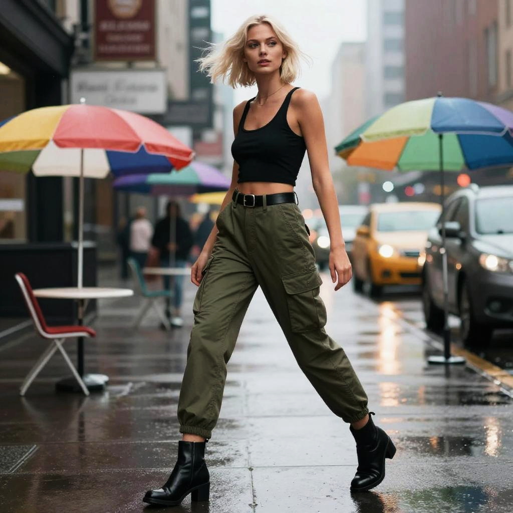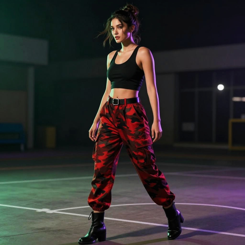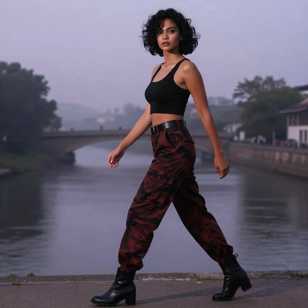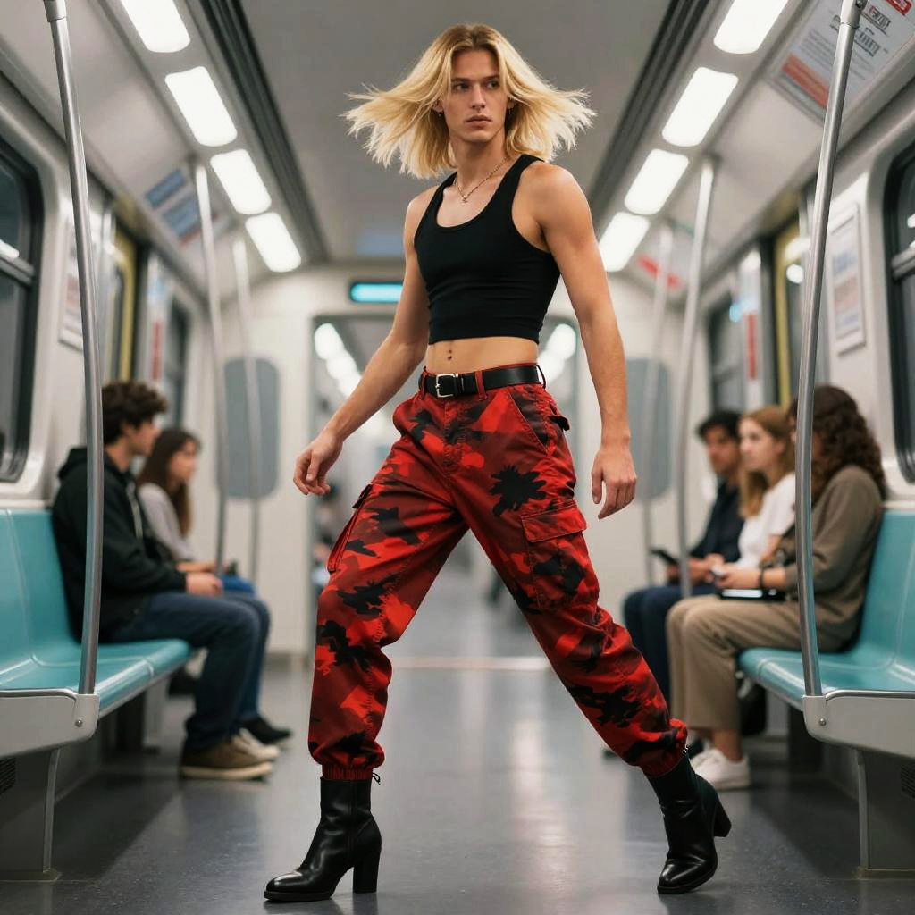 Slim man with spiked silver hair at modern city plaza with reflective glass buildings, wearing a black cropped tank top with a scoop neck, red and black camouflage cargo pants high-waisted, black belt with a silver buckle, cuffed hems, black ankle boots with a slight heel; full-body pose with confident stride, hair in motion, soft white and amber daylight, fashion editorial vibe, photorealistic, dynamic composition, shallow depth of field, 35mm lens, crisp fabric folds, realistic skin texture, cinematic contrast, faint haze, subtle bokeh.
