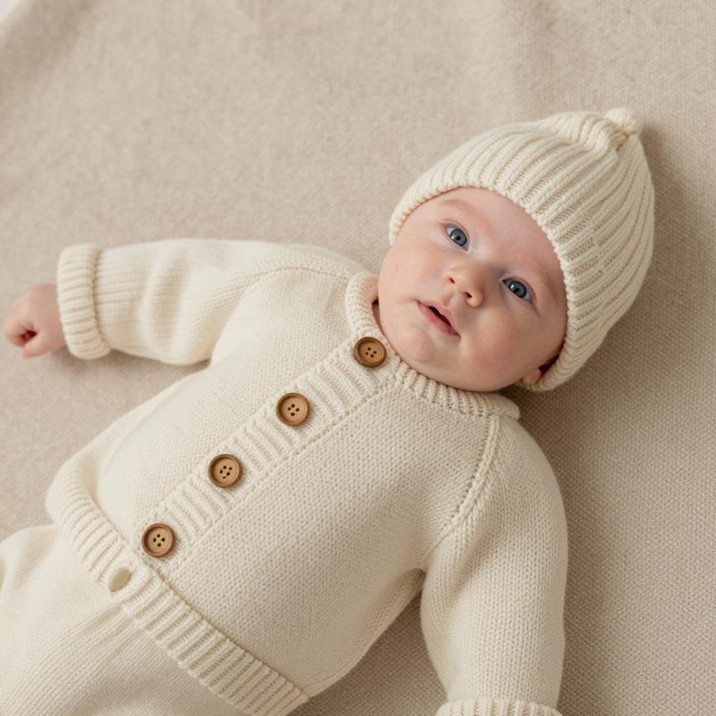 Close-up top-down view of a newborn baby lying on a beige knitted blanket. The baby has light skin, blue eyes, and chubby cheeks with a relaxed expression. The baby is dressed in a cream-colored knit cardigan with wooden buttons, matching knit hat, and cream pants. The soft lighting and neutral tones create a cozy atmosphere.