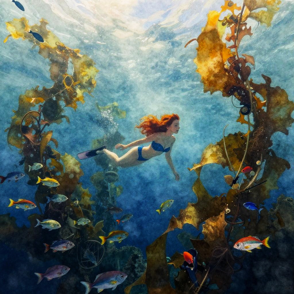 Deep sea ariel swimming gracefully among giant kelp forests with schools of colorful fish, soft light filtering through the water, watercolor style with intricate brush strokes