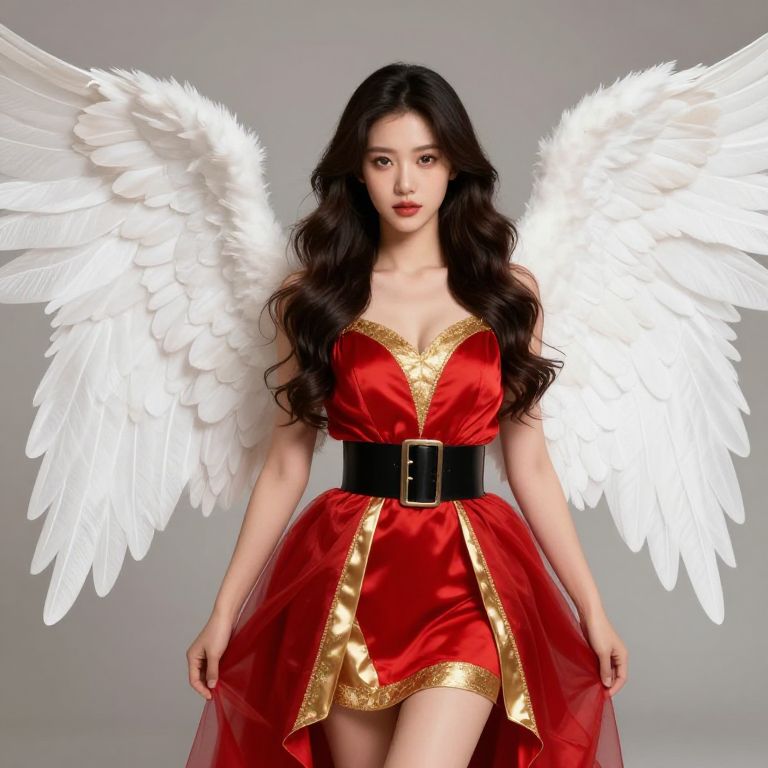 Female angel with angel wings, wearing a red and gold dress with a black belt.