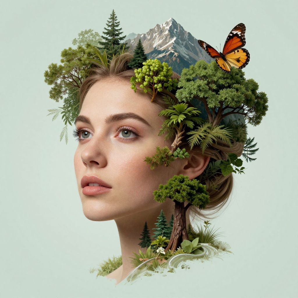 A surreal portrait of a woman's face, adorned with nature elements like trees, butterflies, and mountains, symbolizing ecology and a free spirit.