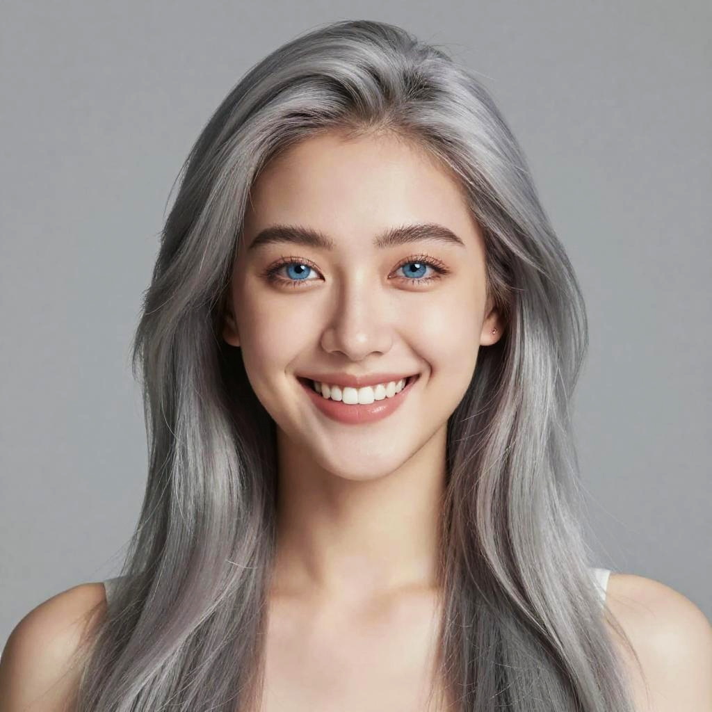Photograph of a young woman with long, silver-gray hair and blue eyes, smiling brightly. Her skin is fair, and she has well-groomed eyebrows and subtle makeup. The background is a plain, soft gray, keeping the focus on her face. The lighting is even, highlighting her hair's shiny texture and her clear, friendly expression.
