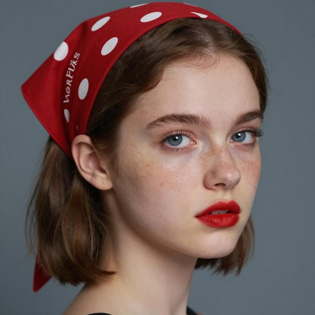 1girl, solo, portrait, realistic, looking at viewer, brown hair, freckles, simple background, closed mouth, lips, blurry, ribbon, looking back, eyelashes, red ribbon, blue eyes, nose, photorealistic, red lips, grey eyes, blue background, short hair, hair ribbon, grey background, bandana