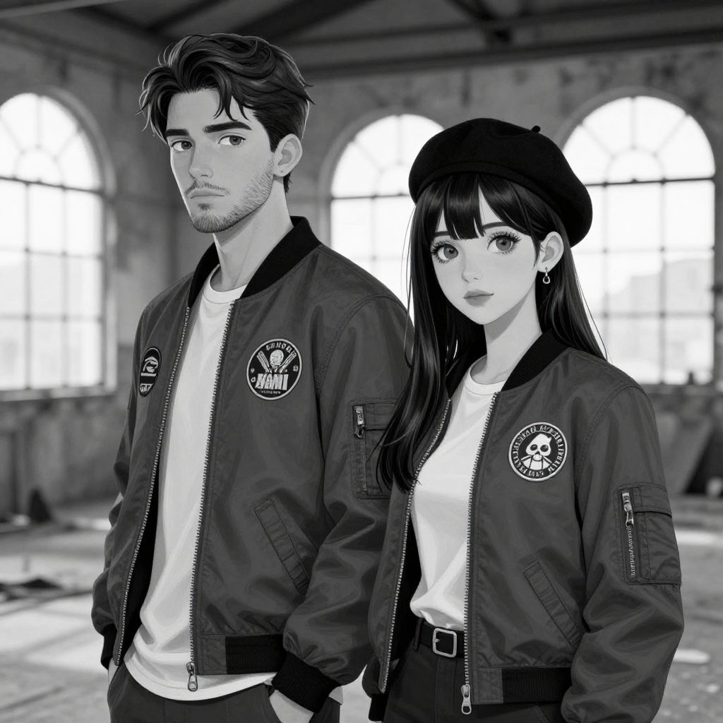 Black and white digital illustration of two young adults in a realistic manga art style. The male figure has short dark hair, a beard, and wears a bomber jacket with patches. The female figure has long dark hair, a black beret, and a matching bomber jacket. They are posed side by side in an abandoned warehouse with large arched windows providing soft natural light, showcasing detailed facial expressions and textured clothing.