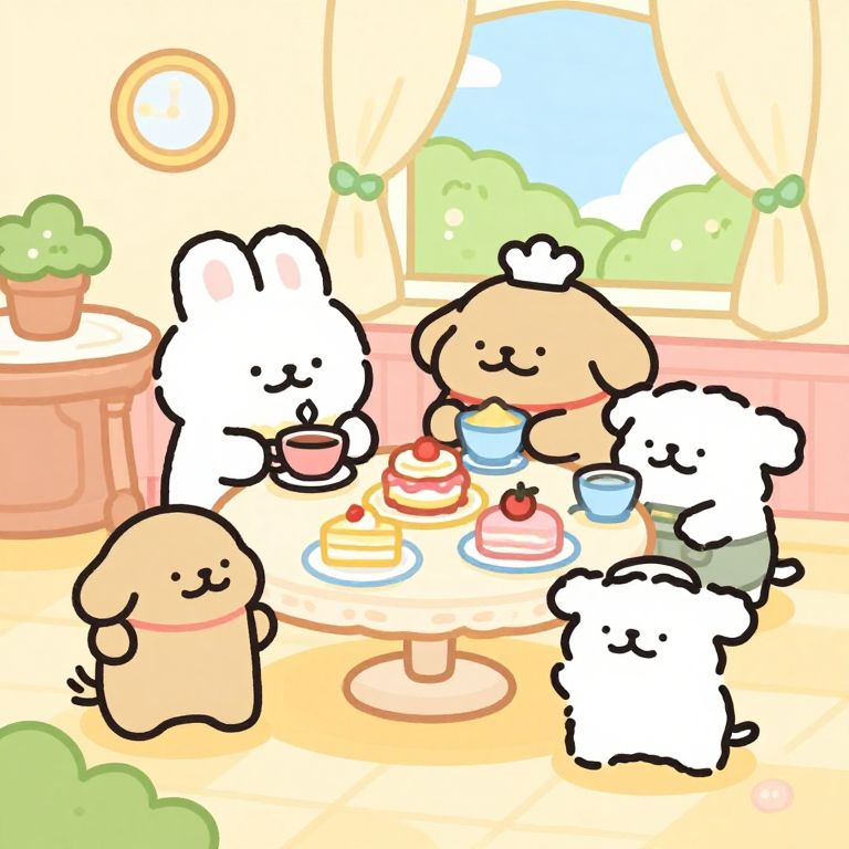 Adorable cartoon dogs enjoy a colorful tea party with cakes and drinks in a bright, sunny room. Digital art, pastel colors.