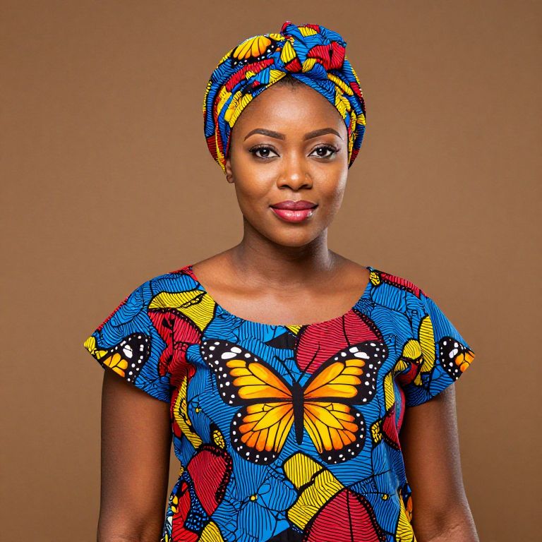 Photograph of a beautiful African woman with dark skin, wearing a vibrant blue and red butterfly-patterned dress and matching headwrap, set against a brown