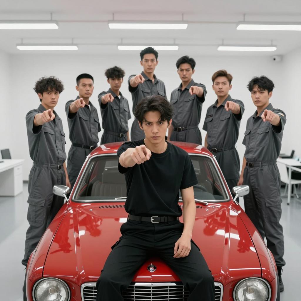 Three men in gray, wet, astronaut-style jumpsuits stand in an urban setting. Two wear transparent plastic hoods, one has a black helmet. Background: tall buildings, air conditioning units, yellow crane arm. All men have short hair, wear patches and armbands, and stand with hands on hips or at sides. Lower man holds a black camera. Wet suits cling to bodies. Two men look upward, one looks straight ahead. Buildings are brick and concrete.