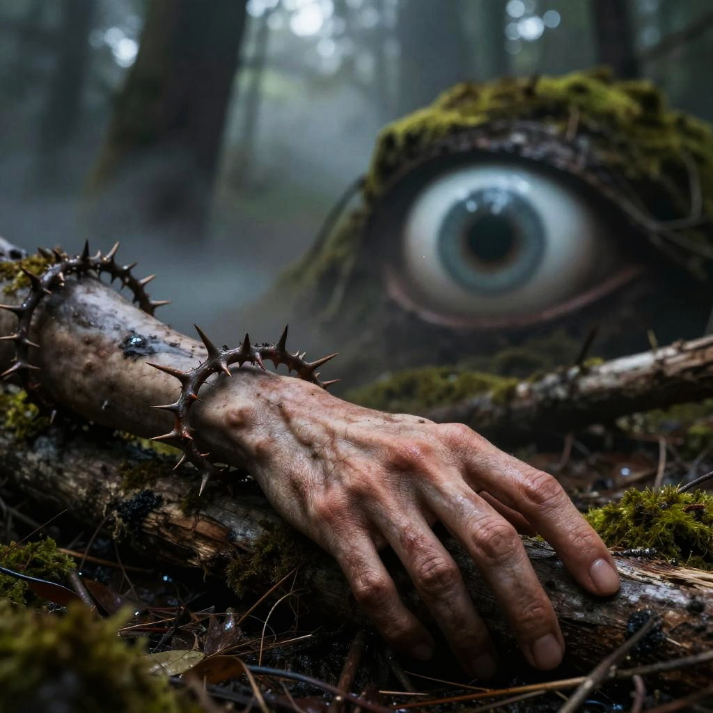 Photograph of a forest setting with a close-up of a human hand, covered in moss and thorns, resting on a mossy log. The hand is detailed, with visible veins and slightly dirt-streaked skin. In the background, a large, realistic eye with a blue iris and dark pupil is partially visible, emerging from the tree trunk, giving a surreal, almost monstrous impression. The forest is dimly lit, with mist and blurred trees creating a mysterious atmosphere. The overall color palette includes dark greens, browns, and the blue of the eye. The image has a hyper-realistic, slightly surreal style.