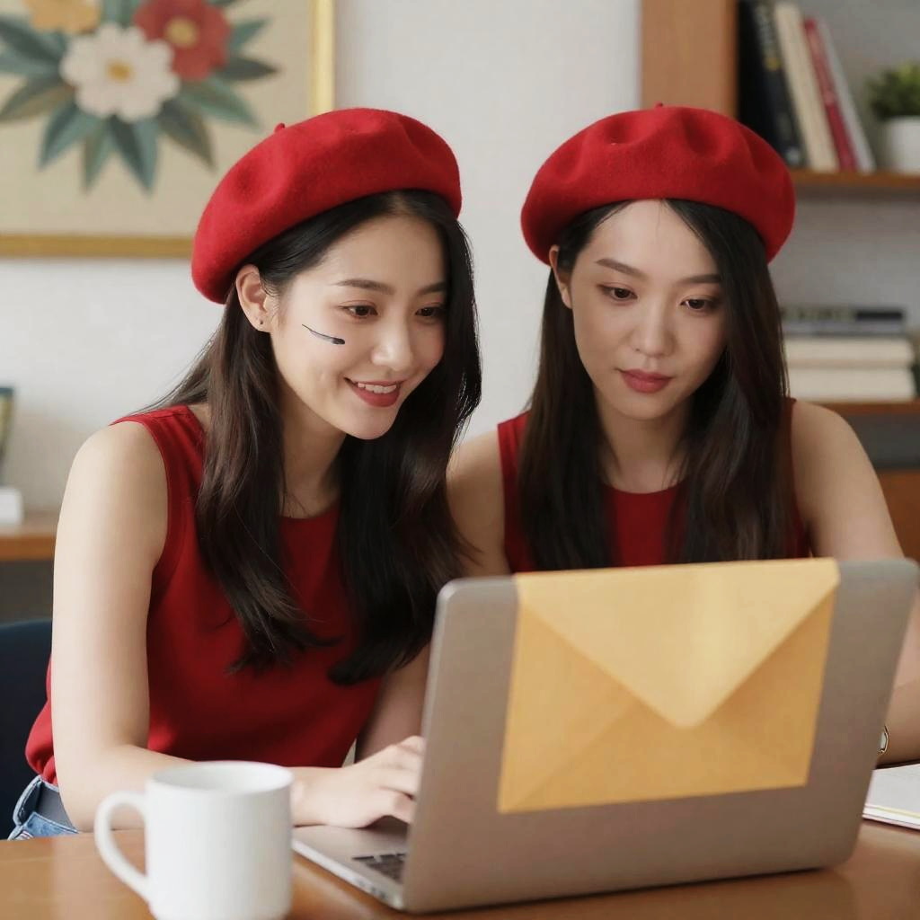 Two women sitting on stage, facing each other. Woman on left in fur coat, beige hat, holding clipboard. Woman on right in red blouse, black pants, holding tablet. Both smiling. Background has empty seats, stairs. Woman on right holding tablet, woman on left holding clipboard.