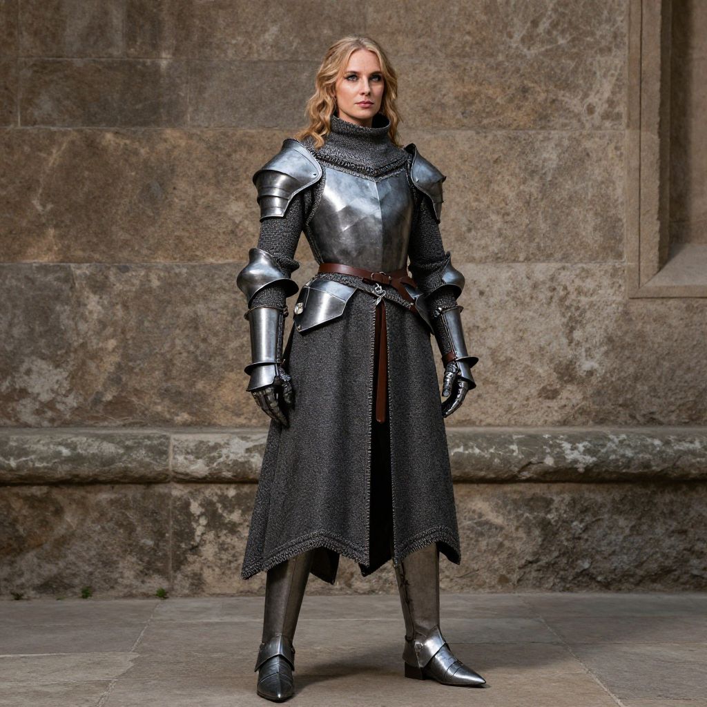 Woman Knight Costume, woman in a medieval outfit standing in front of a stone wall