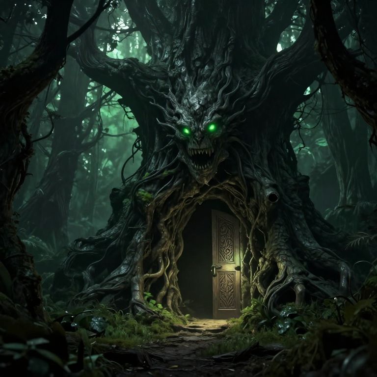 The image depicts an eerie and foreboding scene set in a dense, mystical forest. A massive, beastly monster with glowing green eyes and a menacing grin stands at the entrance of its hideout, a large, ancient tree with twisted branches and a hollow trunk. The creature's body is composed of dark, rocky textures, giving it an almost organic appearance. To the right of the monster, a wooden door with intricate carvings and a glowing light emanating from within suggests a portal to another world. The forest around the hideout is dark and shadowy, with twisted trees and underbrush, adding to the ominous atmosphere. The overall color palette is dominated by deep greens, blacks, and grays, creating a sense of depth and mystery. The composition is balanced, with the monster and the door as focal points, drawing the viewer's eye through the scene. The image is highly detailed, with textures and lighting effects that enhance the sense of realism and depth, making it appear as if it could be a scene from a video game like League of Legends, World of Warcraft, or Hearthstone.
