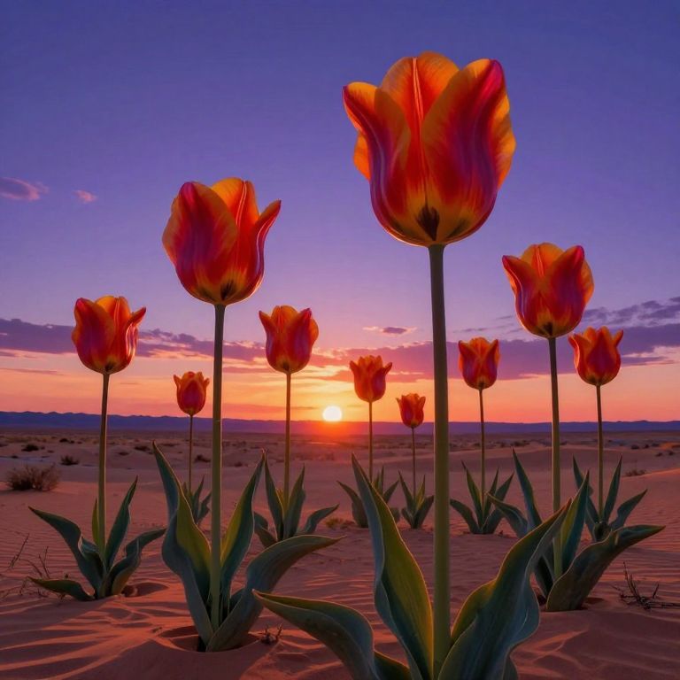 Imagine a surreal watercolor scene depicting an expansive desert landscape with time-bending elements scattered across the sand dunes from a close-to-the-ground perspective. As viewers draw nearer to one of these peculiar constructs, it transforms into a blossoming flower, its translucent petals refracting the warm glow of the setting sun. This dreamlike tapestry invites curiosity and astonishment as it blurs the line between reality and fantasy, inviting viewers to explore its intricate details.