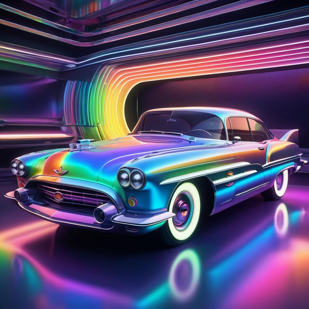 Ultra-realistic painting of a retro-futuristic car with intricate details, volumetric rainbow lighting, and symmetry, rendered in Unreal.