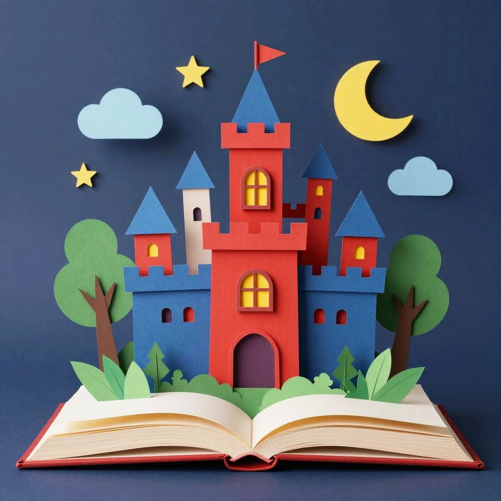 This is a colorful, whimsical, 3D paper cutout illustration of a fantasy castle at night. The castle has red and blue towers with a yellow window, surrounded by green trees, clouds, stars, and a crescent moon. It's set in an open book with layered, textured pages at the bottom. The overall style is playful and dreamy, with bold, contrasting colors.