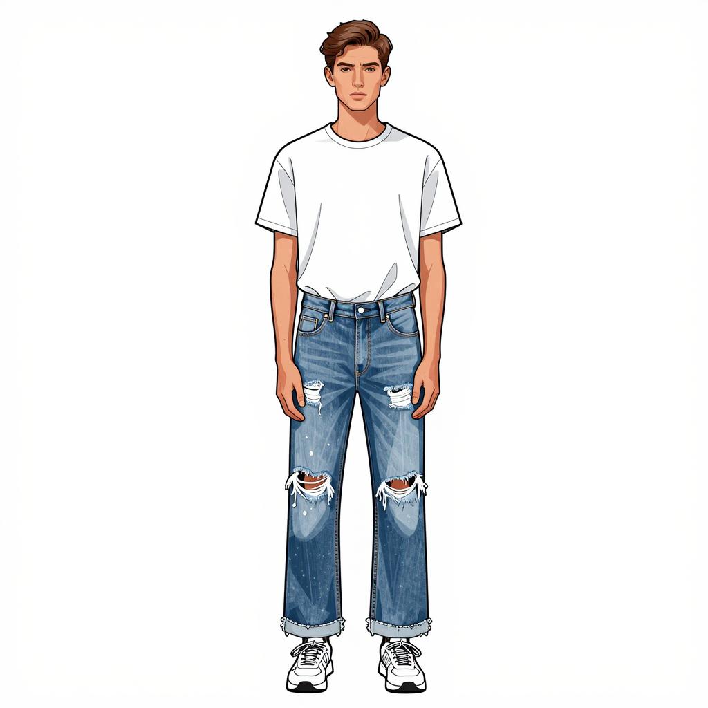 Colouring-In Sheet a fashion minimalist outfit for men weared by a model for summer mixing issey miake, heliot emile style with technical and organic materials. the shape are simple but super detailled on a white background, with used jeans pieces,