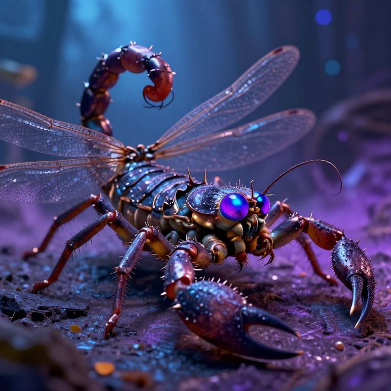 The image depicts a fantastical creature that is a fusion of various elements, combining the features of a scorpion, a dragonfly, and a spider. The creature has a large, bulbous eye with a vibrant purple and blue glow, reminiscent of a dragonfly's eye. Its body is segmented like a scorpion's, with multiple legs and a tail, each adorned with sharp, jagged claws. The creature's head is crowned with a pair of long, segmented antennae that resemble a dragonfly's mandibles. The body is covered in a textured, spiny exoskeleton, giving it a rugged and formidable appearance. The background is a mix of deep blues and purples, with hints of orange and yellow, creating a dramatic and otherworldly atmosphere. The overall composition is dynamic, with the creature positioned centrally, drawing the viewer's eye to its intricate details and the interplay of its various components.