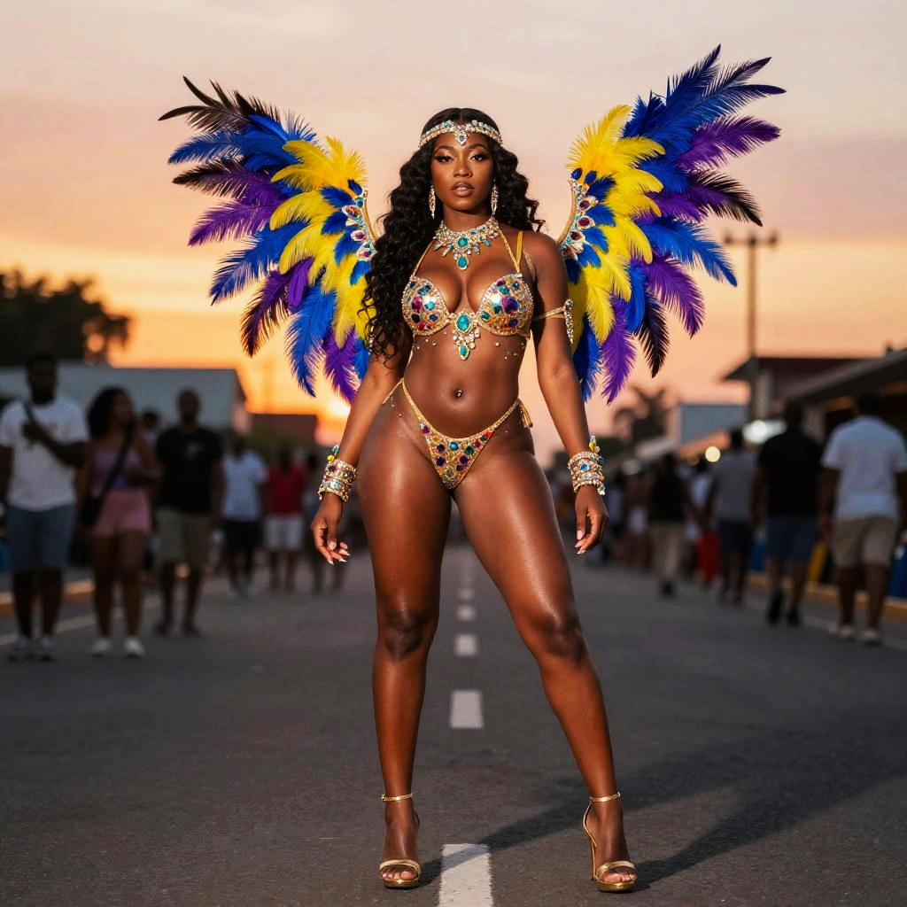 Photograph of a confident Black woman with curly hair dancing on a sandy beach at night. She's wearing a colorful, patterned bikini with blue, red, and yellow accents. Her skin is glowing in the dim light, and she's smiling with her eyes closed. The background is blurred but shows a group of people and string lights, creating a festive atmosphere.