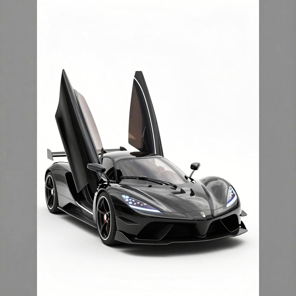 This is a digital CGI image of a futuristic, black drone-car hybrid with sleek, aerodynamic lines and two spinning propellers on top. The car has a glossy finish and reflective surfaces, standing on a shiny, white surface that reflects its image. The background is a bright, gradient white, giving a high-tech, sci-fi vibe. The overall look is modern and futuristic.
