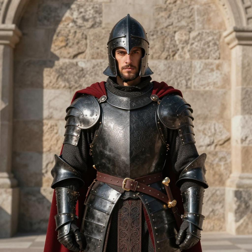Photograph of a male knight in full medieval armor standing in front of a stone archway. He has a dark beard and serious expression, wearing a black steel helmet with a nasal guard. His black, intricately patterned plate armor covers his chest, shoulders, and arms, with a red cape draped over his shoulders and a brown leather belt with a gold buckle around his waist. The background consists of textured, light brown stone blocks, and the sunlight casts shadows, highlighting the armor's reflective surface. The image has a realistic, historical style.