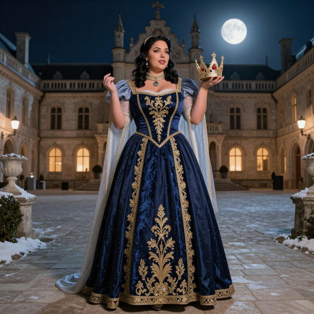 A regal plus-size woman with dark wavy hair and a defined jawline, wearing a dramatic princess cut dress plus size in deep navy with gold embroidery; the dress has an elegant high collar, a structured shape, and a flowing, sheer back; she stands in a moonlit courtyard of an old European castle, holding a crown, dressed for a royal costume performance during a winter ball. The woman has big tits and cute face