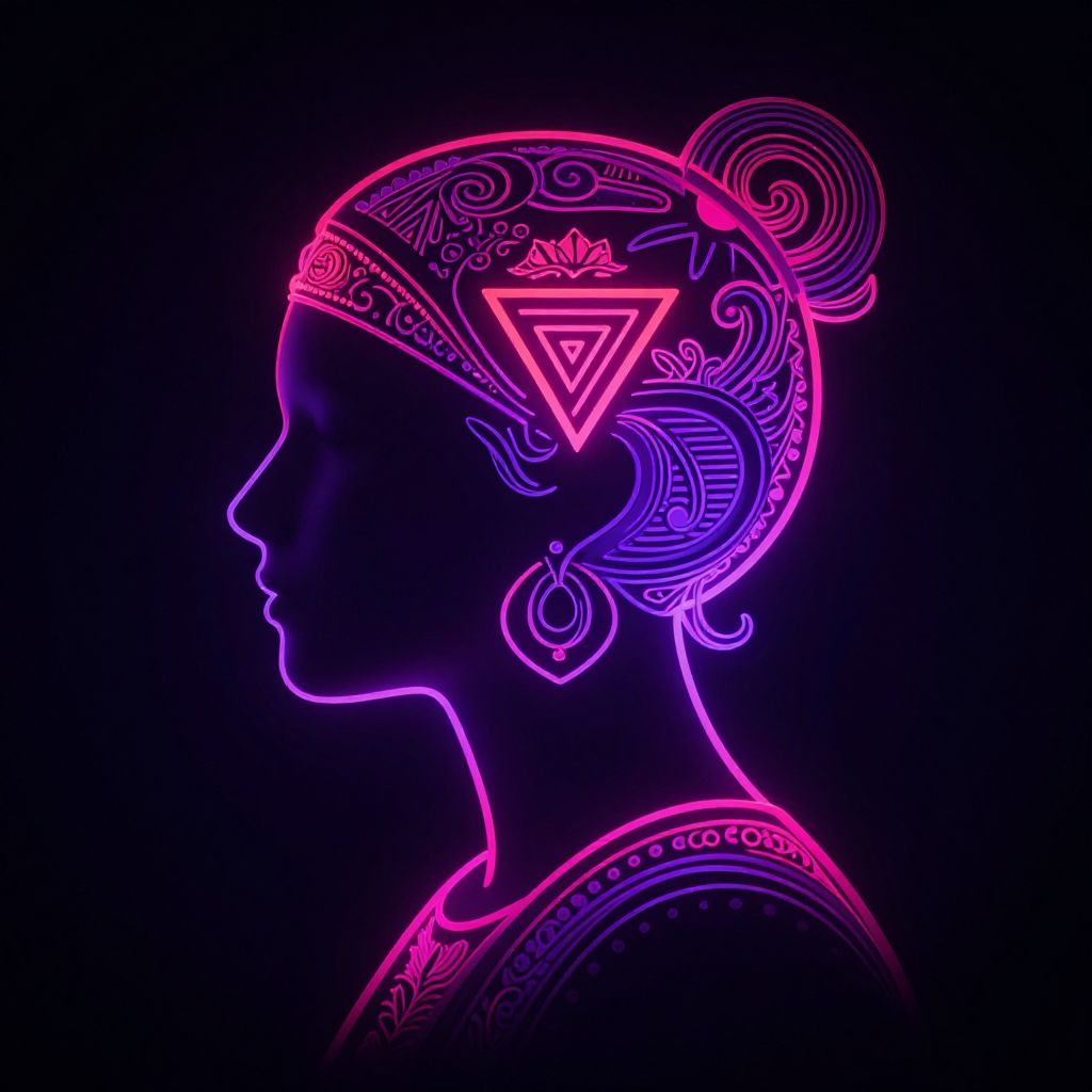 Neon-lit silhouette of a woman's profile, featuring intricate, glowing pink and purple patterns on her head and hair, with a prominent triangle design