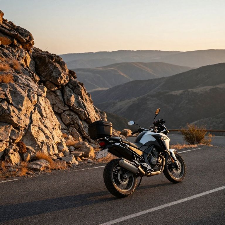 Estacionado motorbike on a mountain road, panoramic view of vast landscape, golden hour lighting, rugged textures on rocks and asphalt, adventure vibe, photorealistic style, crisp detail