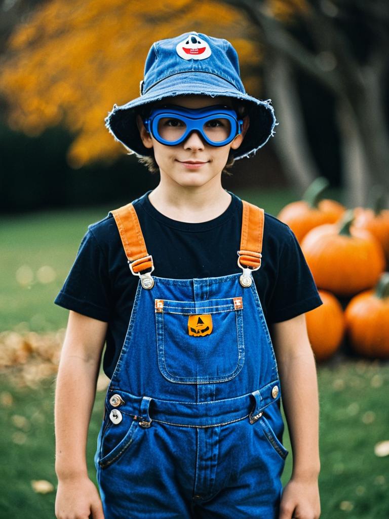 Easiest funny halloween, 1boy, solo, male focus, overalls, looking at viewer, blue overalls, goggles, realistic, blurry background, blurry, hat, upper body