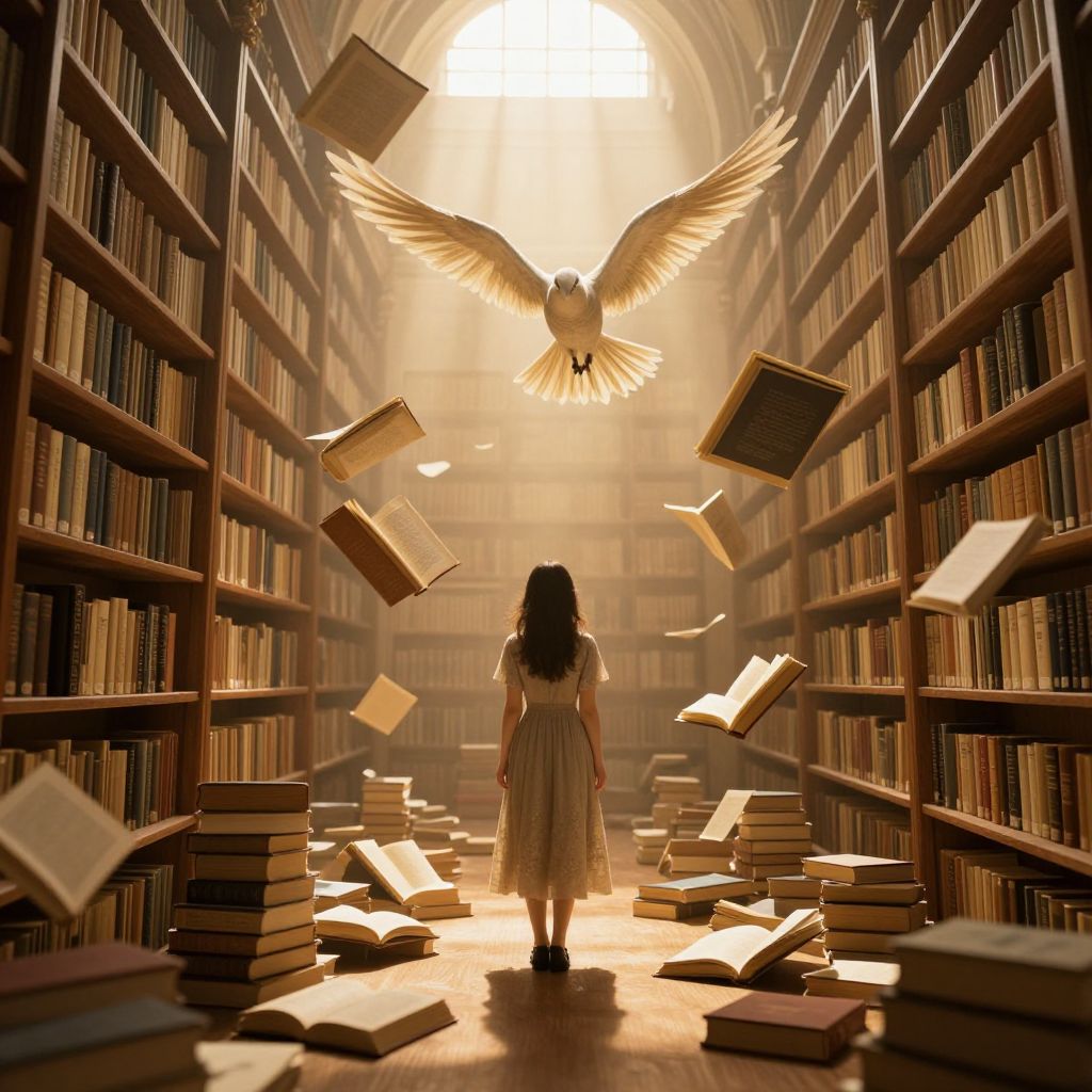 This digital artwork depicts a dimly lit, expansive library with tall, wooden bookshelves filled with books on both sides. At the center, a young woman with long, dark hair, wearing a white, sleeveless dress, stands with her back to the viewer. She is surrounded by floating books and papers, illuminated by a bright, glowing light source at the library's far end. Above her, a large, white dove with outstretched wings hovers in the air. The floor is scattered with more books and papers, creating a sense of chaos amidst the order of the shelves. The overall atmosphere is mystical and ethereal, with warm, golden lighting enhancing the magical feel.