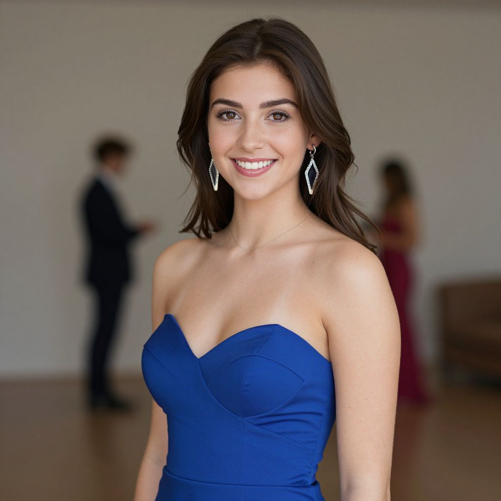 Smokey blue prom dress, 1girl, solo, dress, brown hair, long hair, earrings, jewelry, breasts, cleavage, blue dress, bare shoulders, smile, brown eyes, strapless, looking at viewer, lips, strapless dress, blurry, blurry background