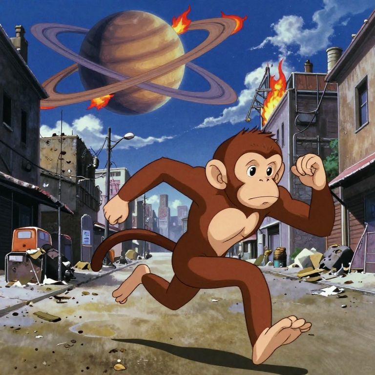 Sprite monkey running down the street of a dirty city with the planet saturn in the sky with flames, 90s anime, nintendo, line art, hayao miyazaki,