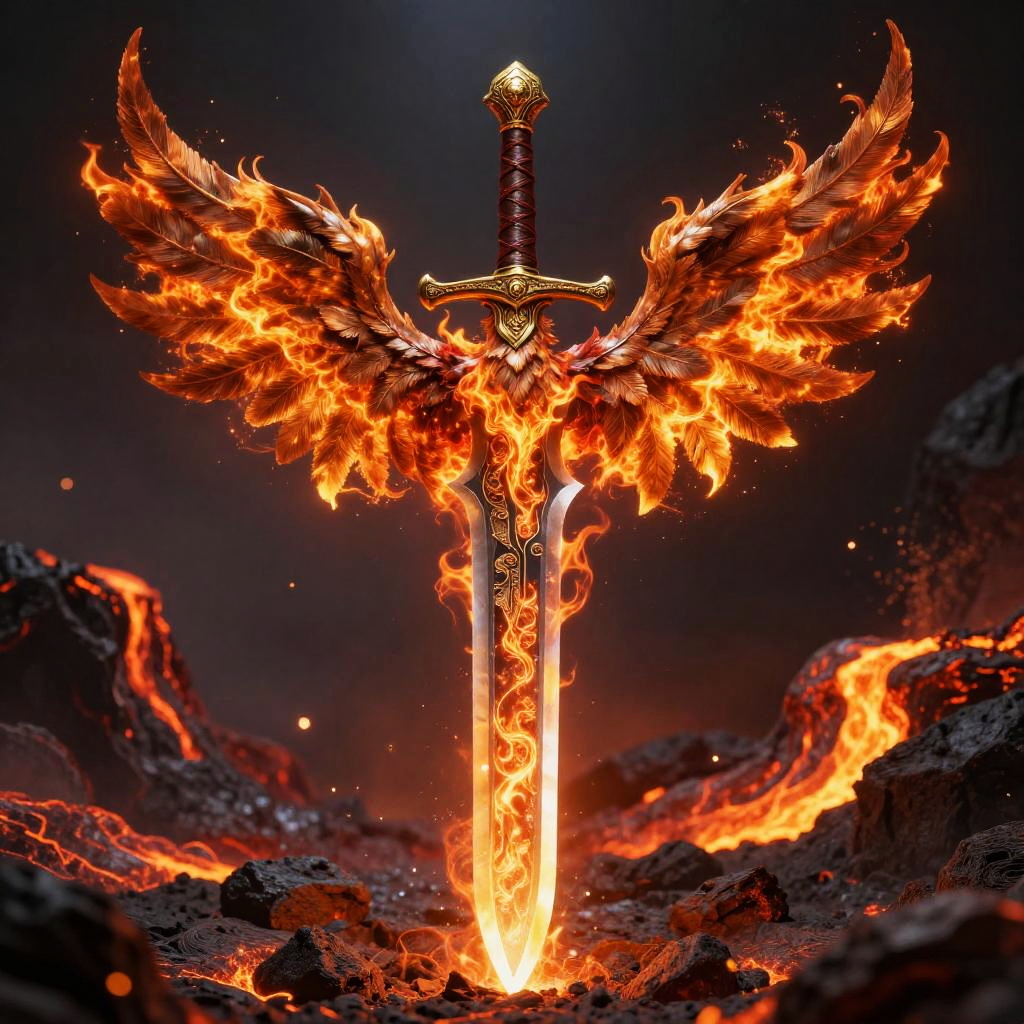 Fantasy greatsword designs inspired by mythical creatures, the blade resembling a phoenix’s fiery wings with dynamic flame effects, intricate feathers engraved on the hilt made of ancient bronze and leather, set on a volcanic battlefield with glowing lava flows and sparks flying in dramatic lighting.