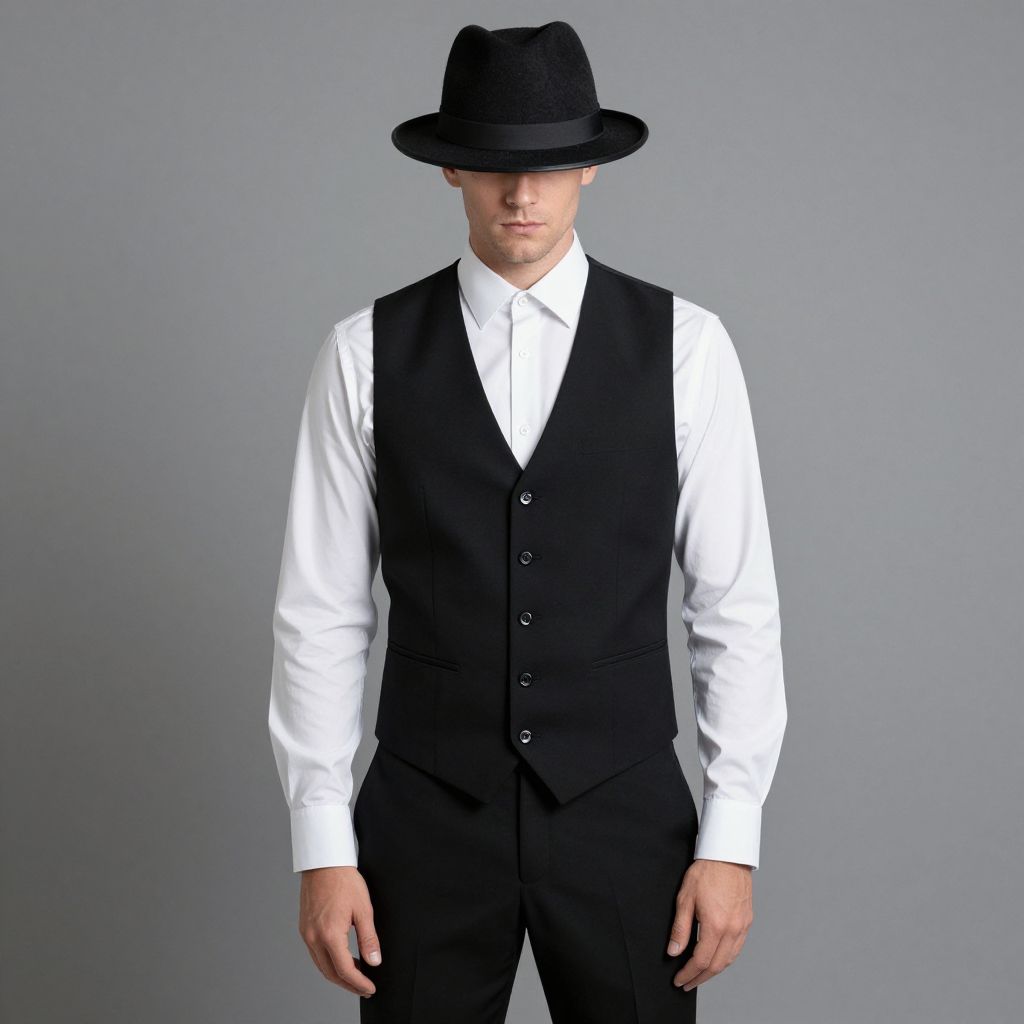 Photograph of a man in a black vest, white dress shirt, black pants, and black fedora hat, standing against a plain gray background.