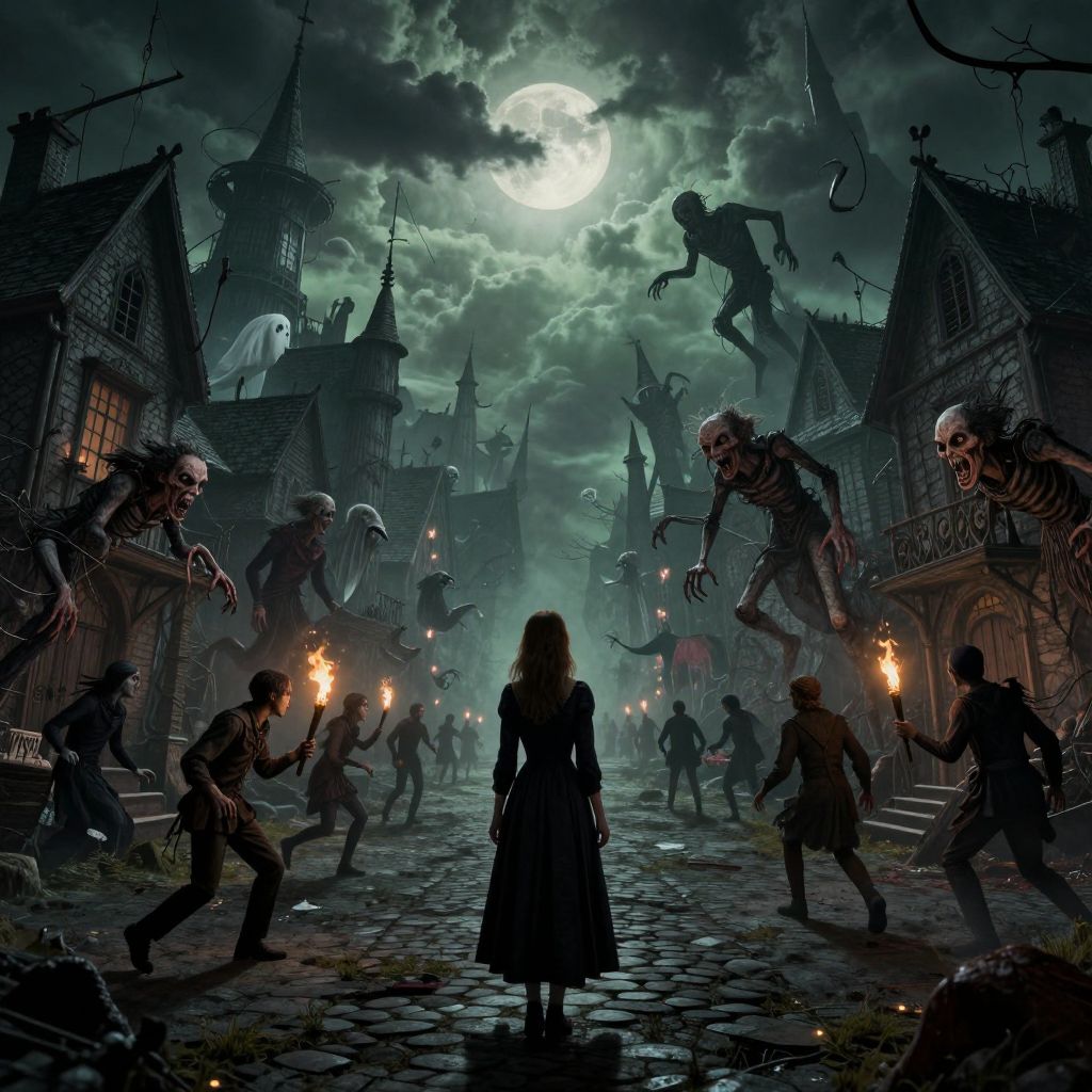 The image depicts a dark, twisted nightmare village, where a strange macabre festival is taking place. The scene is set in a gloomy, gothic village with tall, crooked houses and cobbled streets. The sky is overcast with dark clouds, and the moon is obscured by the clouds, casting an eerie, greenish light over the village. The village is filled with various supernatural creatures, including ghosts, ghouls, and other eerie beings, all of which are floating or walking around the village. The creatures are depicted with twisted, grotesque features, adding to the macabre atmosphere. In the foreground, a woman in a dark dress stands with her back to the viewer, looking out over the village. She is surrounded by a group of people, some of whom are carrying torches, adding to the sense of tension and unease. The overall composition is dynamic, with the creatures and people moving in various directions, creating a sense of chaos and disarray. The interplay of colors, textures, and shapes creates a sense of depth and complexity, making the scene both visually rich and structurally compelling.