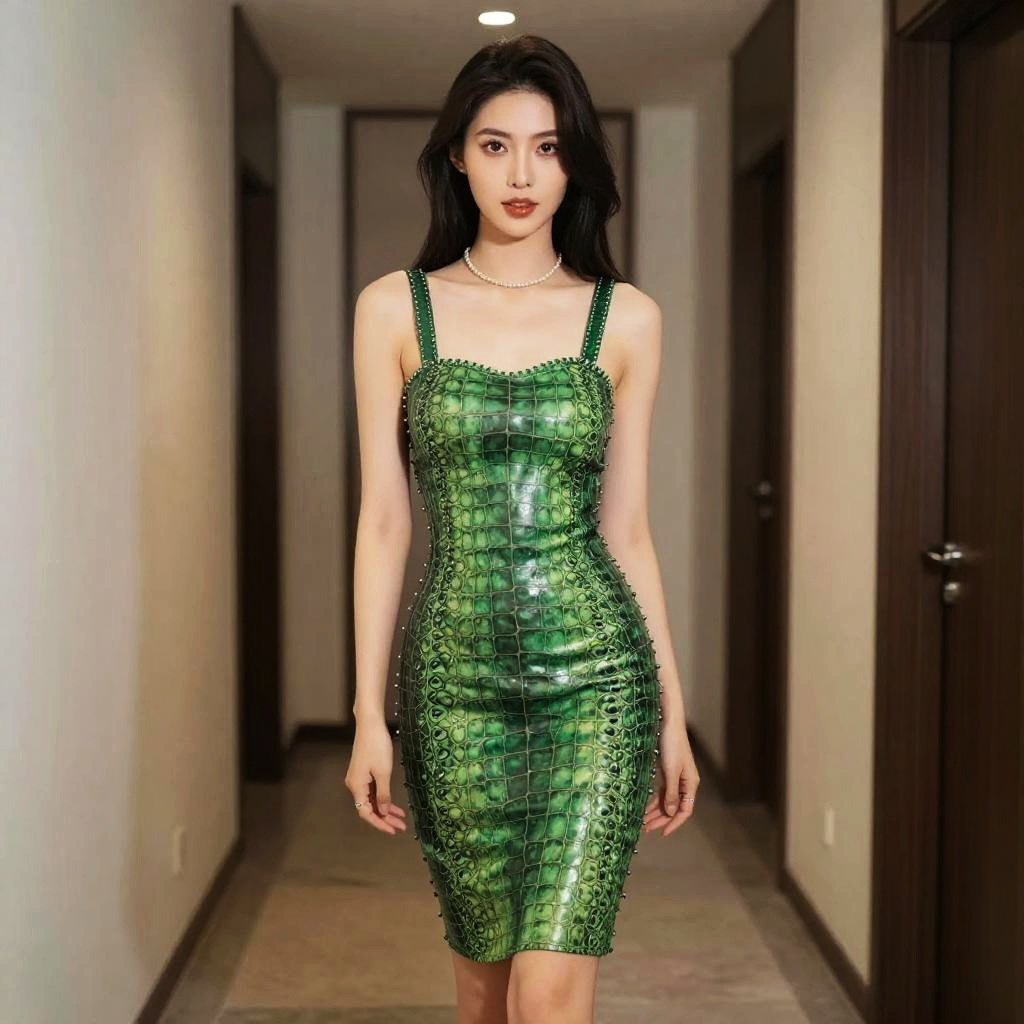 Portrait of an Asian woman standing in a hallway wearing a fitted green dress with a crocodile skin texture and studded detailing. The dress is sleeveless with wide straps and a sweetheart neckline. She has long dark hair and is accessorized with a simple pearl necklace and rings on her fingers. The hallway has neutral walls and wooden doors on each side.