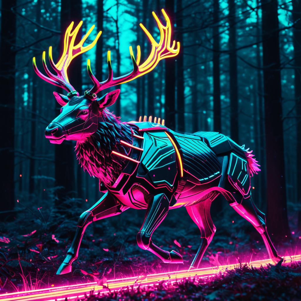 Synthwave neon-armored stag with glowing embers, running free in glowing techno woodland. Set against a pulsing synth haze with radiant neon bloom. Rendered in a sci-fi neo-retro art with vibrant light ripples.