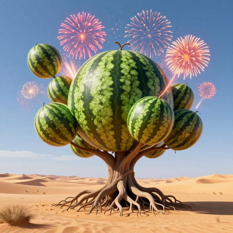 Digital artwork of a surreal watermelon tree in a desert, with large watermelons as branches and vibrant fireworks in the blue sky.
