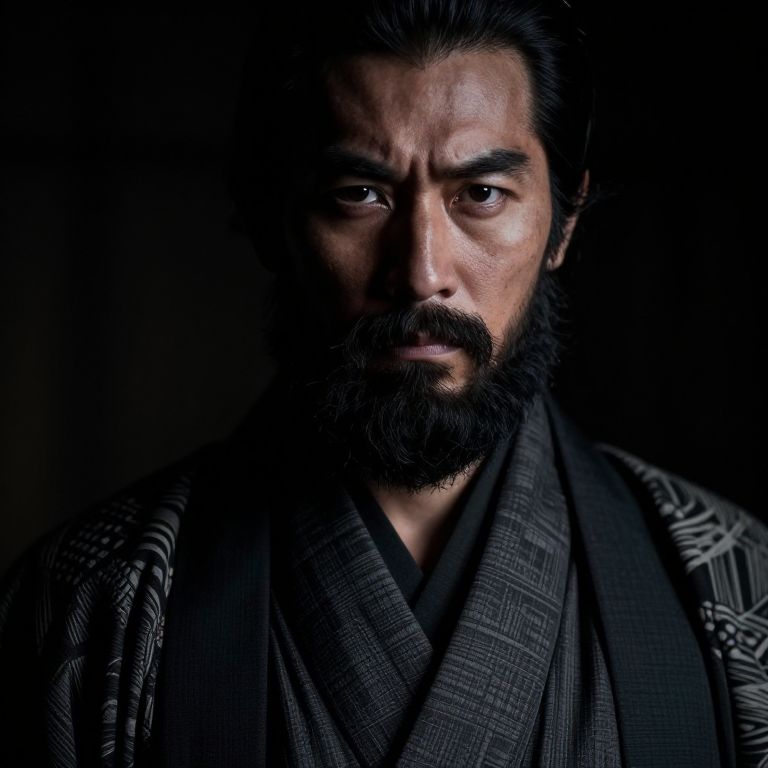 Portrait of a samurai beard warrior, dark moody atmosphere, rugged strength, traditional kimono patterns, close-up on textured beard and stern eyes, historical Japan setting