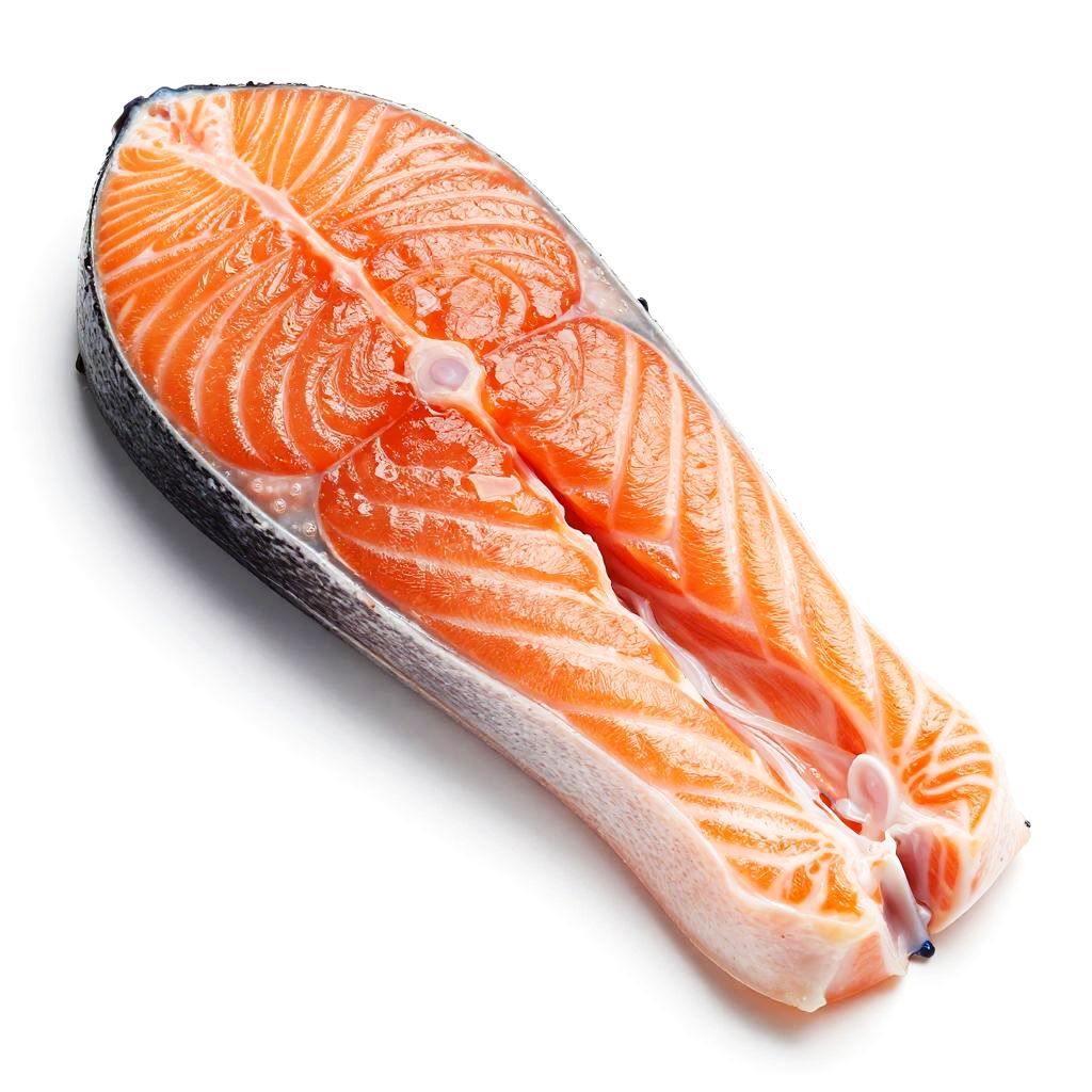 A close-up photograph of a single, vibrant orange salmon fillet. The fish is positioned with its curved edge facing to the right and its thicker side slightly overlapping the thinner side. The bright orange color of the raw fish contrasts sharply with the plain white background. The texture of the fish is slightly translucent with visible skin flakes.