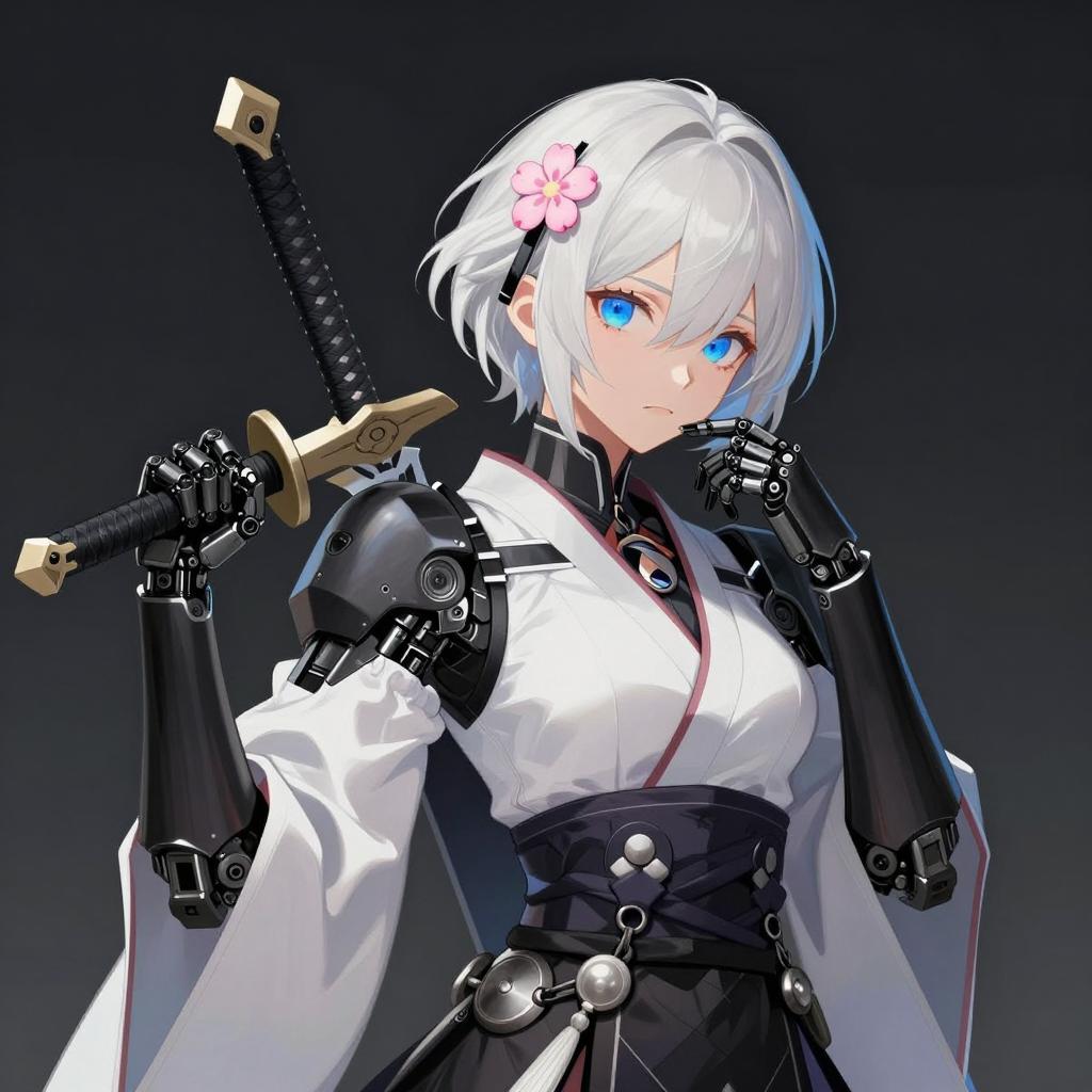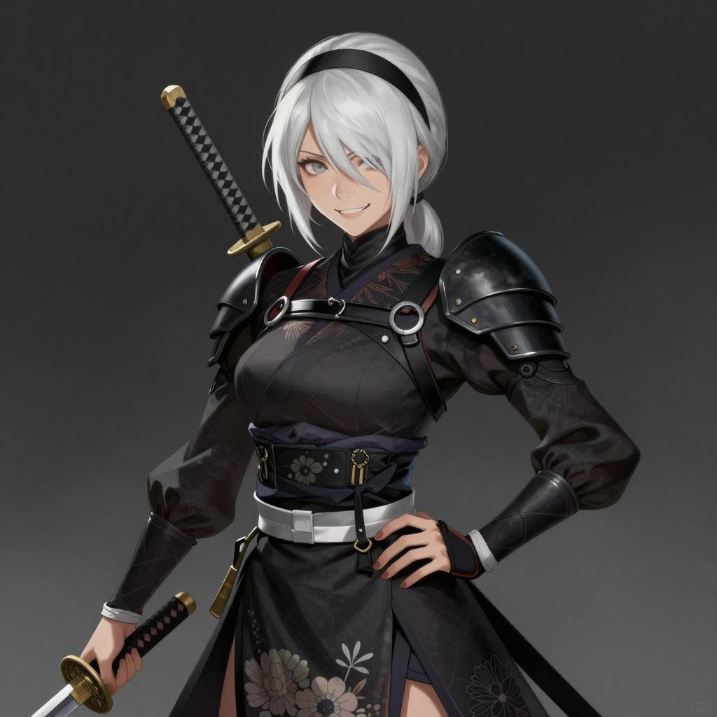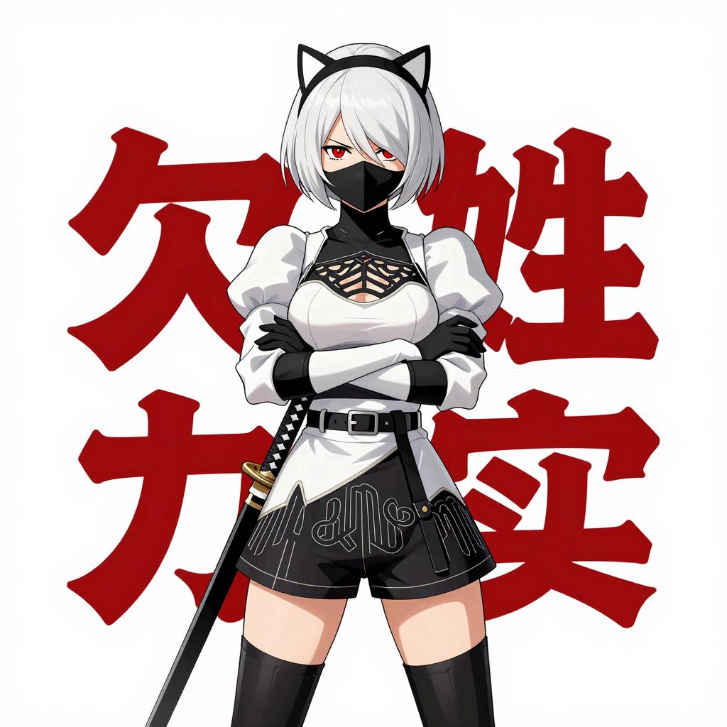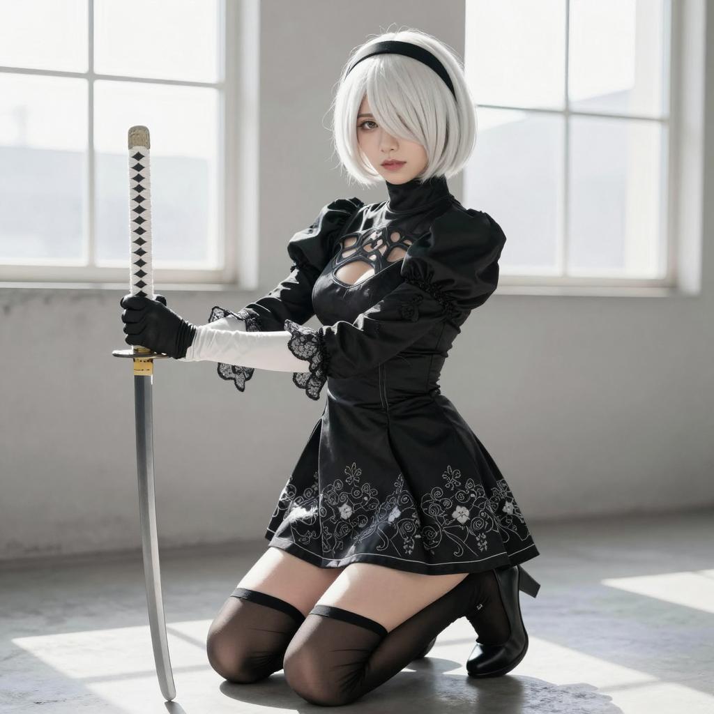 Female character in black gothic outfit with white bob haircut, black gloves, and thigh-high boots. She stands with back to camera, holding a katana over her shoulder. Wooden door frame in background. Bright daylight from outside. Tight, short skirt with lace details. Black thigh-high stockings. High-heeled boots. Standing in doorway, legs apart. Full-body view. Anime-style illustration. Intense gaze.